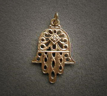 Petite 14K yellow gold Hamsa with fine filigree detailing and a single full cut diamond. Made in the USA. From the House of Raasche Collection.