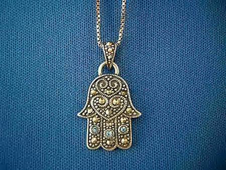 Sterling silver marcasite Hamsa embellished with three light blue cubic zirconias. Sold complete with an 18" sterling silver antiqued box chain and gift box. From the Sterling Collection by House of Raasche.